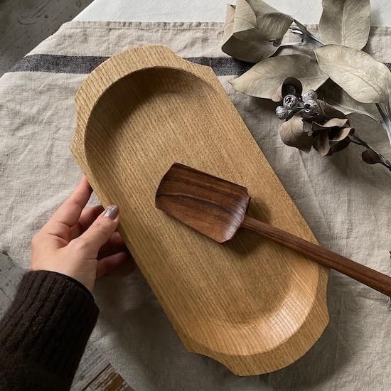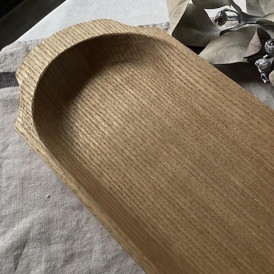 滑らかな彫跡の残る、杢目が美しい舟形のプレートです。