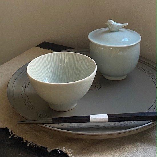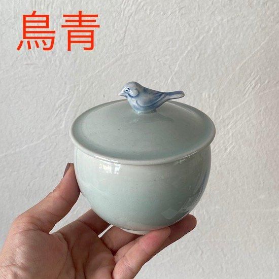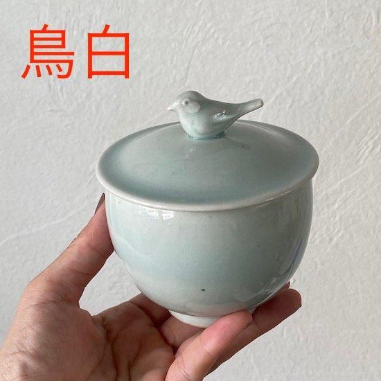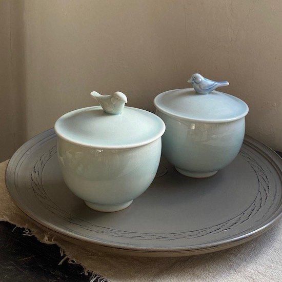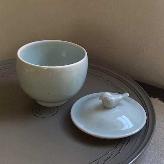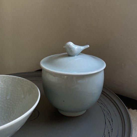 蓋の上にちょこんと乗った、小鳥がとても愛らしいうつわです。