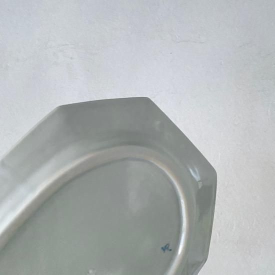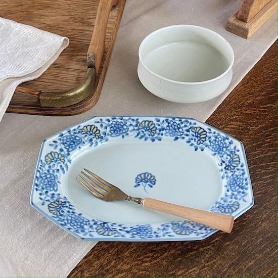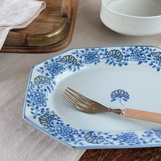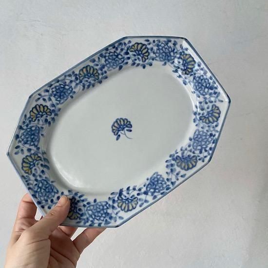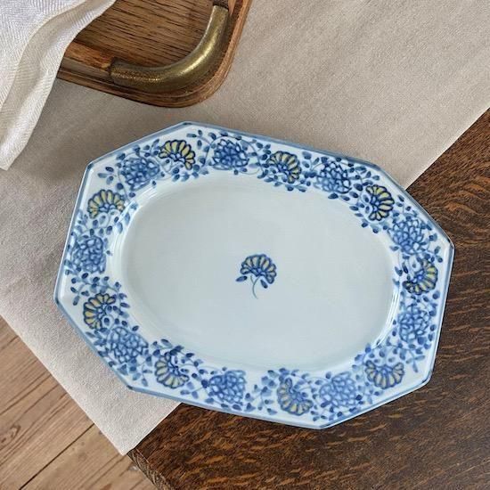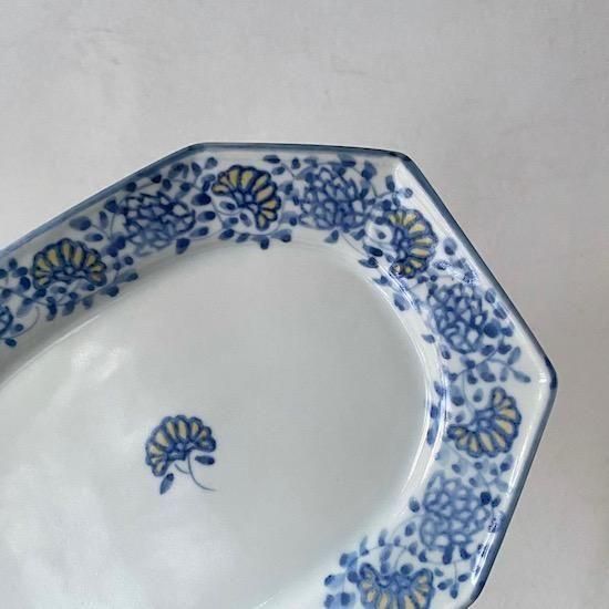 リムにあしらわれた印判手の花唐草が、華やかな八角皿です。