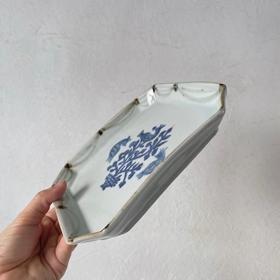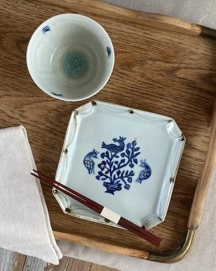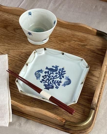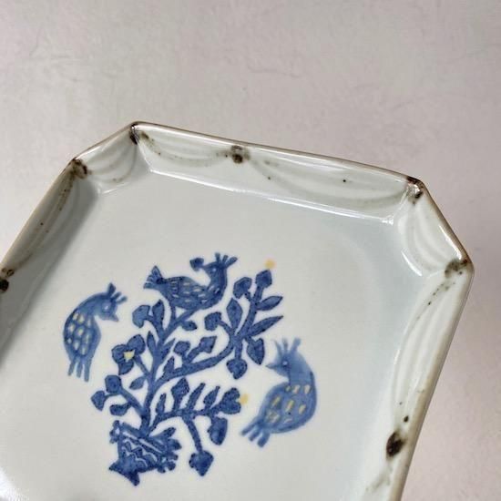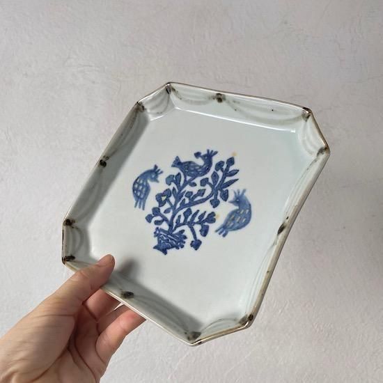 印判手による、自由な鳥たちと生命力あふれる樹木が印象的な四方皿です。